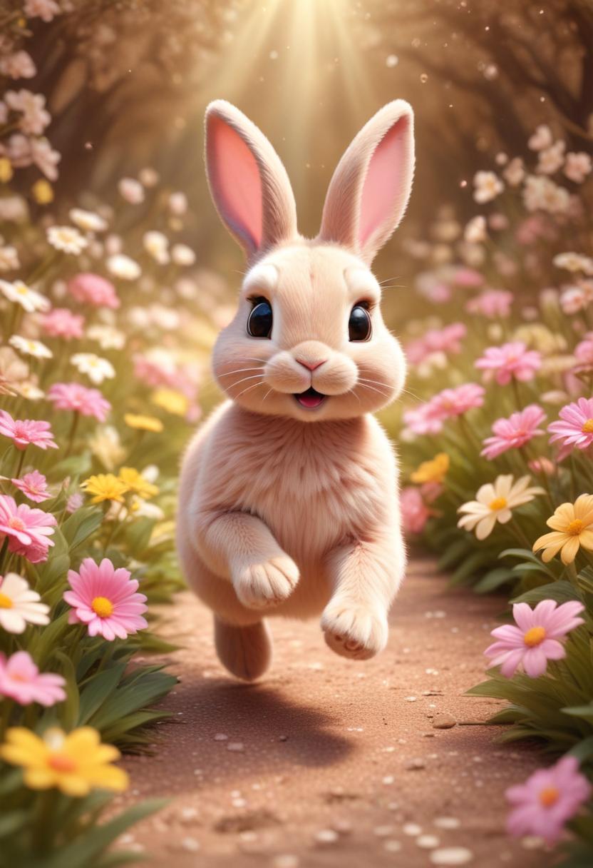 A cute, fluffy bunny hops down a path lined with pink and yellow flowers, sunlight shining through the trees.