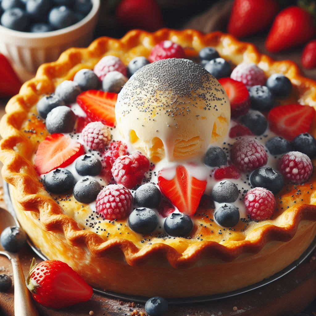 A freshly baked pie with a flaky crust, topped with blueberries, strawberries, raspberries, and a scoop of melting ice cream.