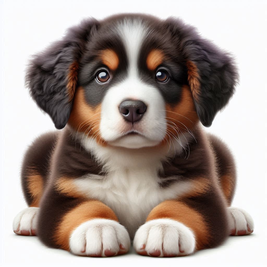 A cute Bernese Mountain Dog puppy with big brown eyes looks directly at the camera, resting its paws on a white surface.