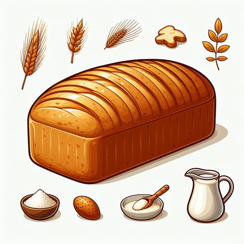 A loaf of bread with wheat, flour, milk, and almond.