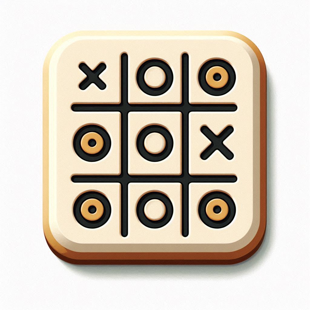 A close-up of a tic-tac-toe board with black lines and circles and x's. The board is a light brown color with a gold outline and shadow.