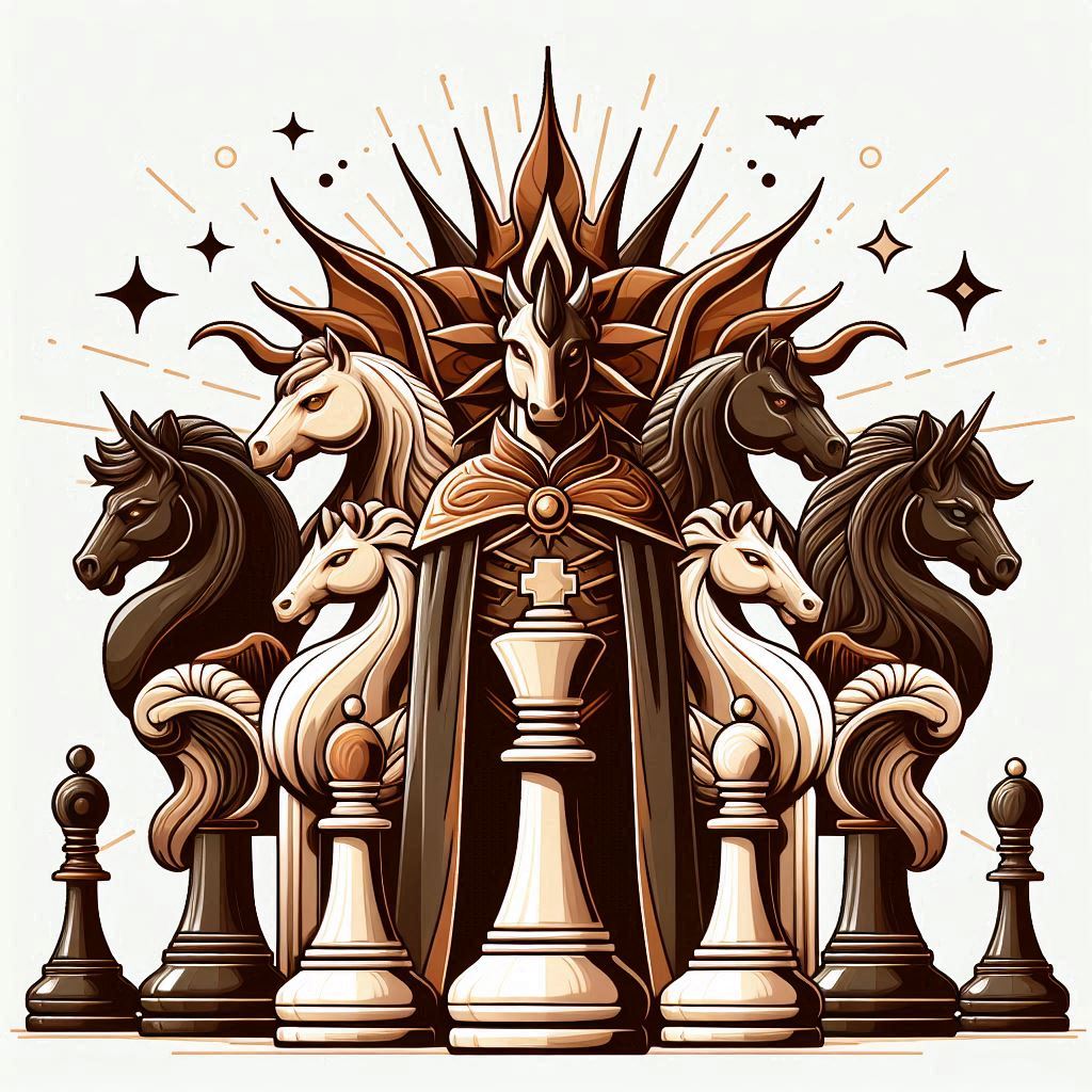 A knight, wearing a crown and robe, stands at the front of a group of chess pieces, with his knight pieces flanking him.