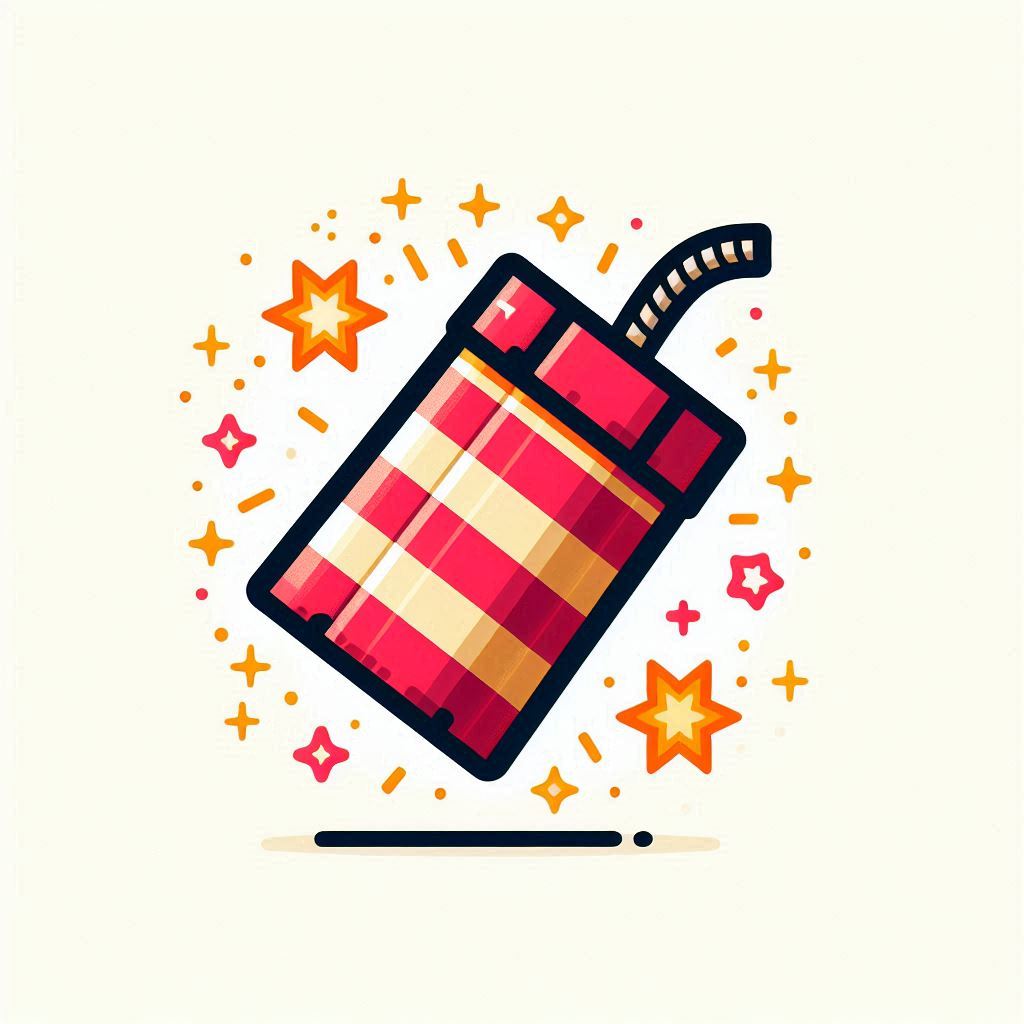 A red and yellow firecracker with a lit fuse is surrounded by stars, suggesting an impending explosion.