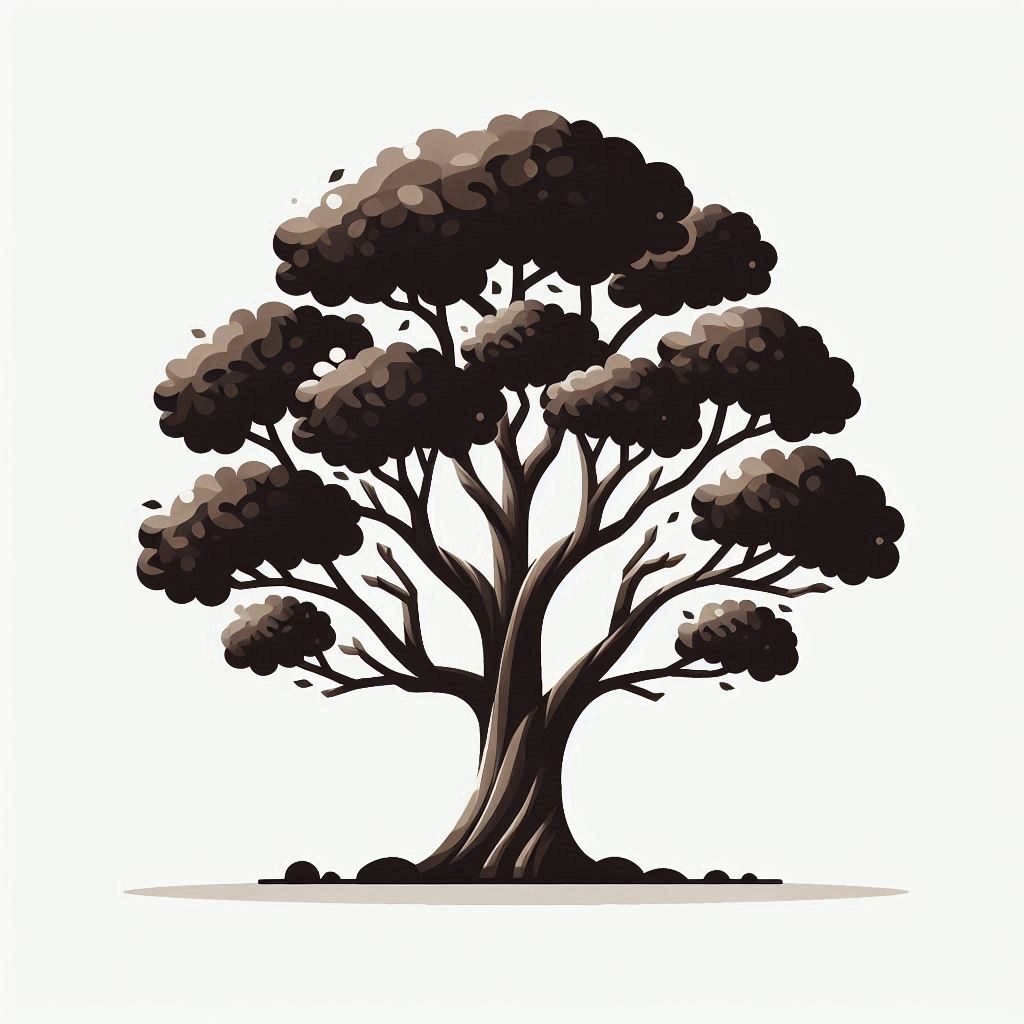 A detailed silhouette of a large tree with thick branches and a twisting trunk, standing on a white background.
