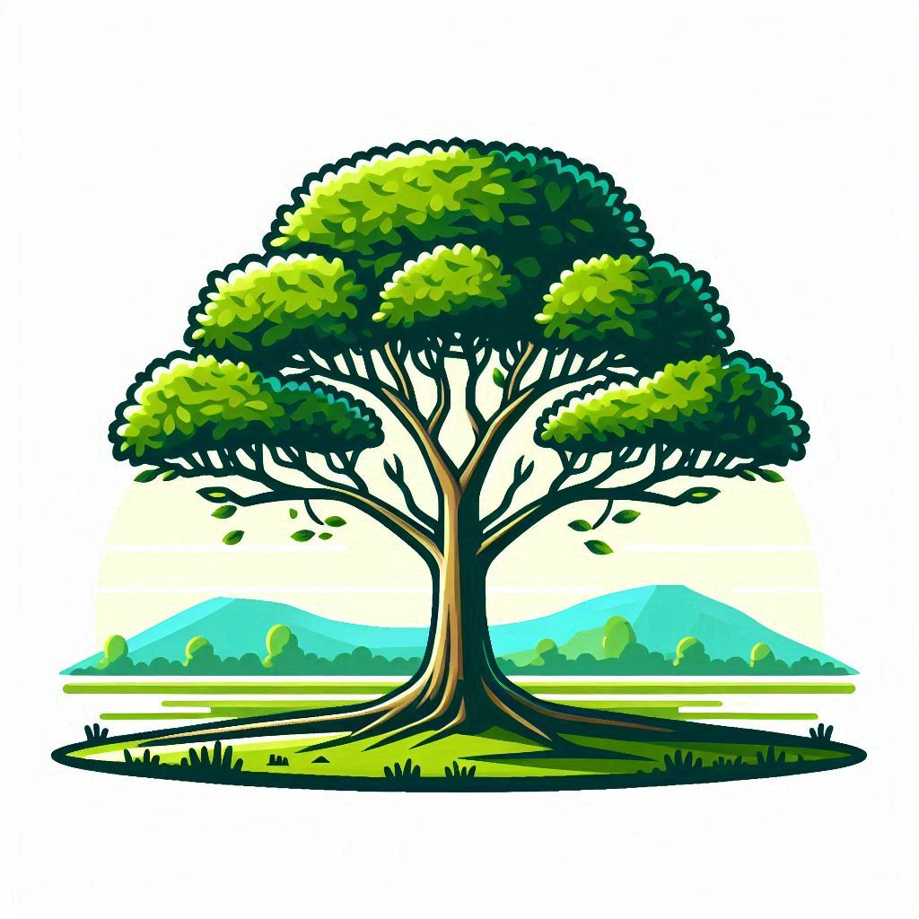 A large tree with green leaves stands in the foreground of a landscape with mountains in the distance.