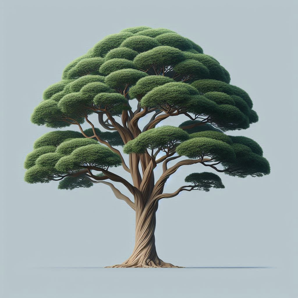 A large green tree with a thick, twisted trunk stands against a light blue background.