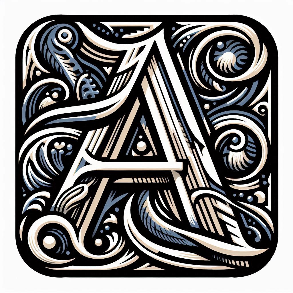 A stylized letter A with intricate decorative swirls and patterns in black, white, and blue.