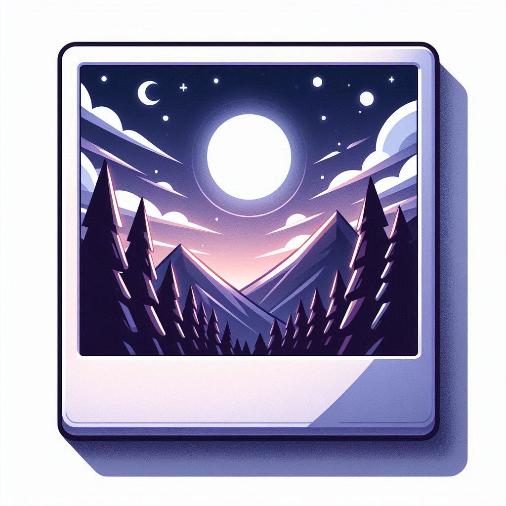 A night scene of mountains and trees under a full moon, depicted in a Polaroid photo.