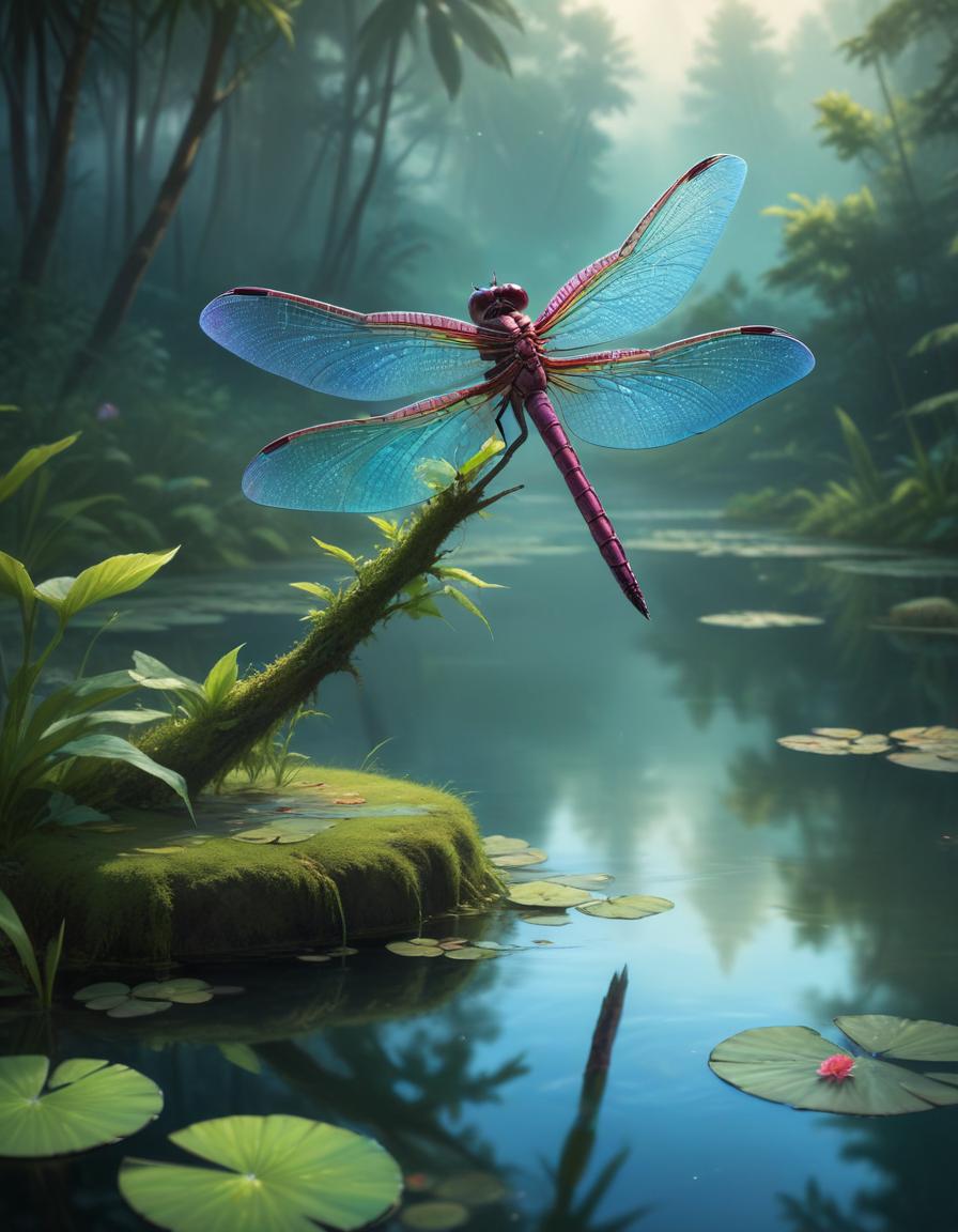 animal, beauty, blue, branch, calm, dragonfly, foliage, forest, green, insect, lily, nature, pad, peaceful, pond, red, serene, still, water, wildlife