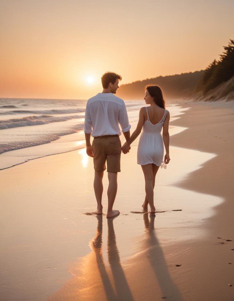 A couple walks hand-in-hand along a sandy beach at sunset.