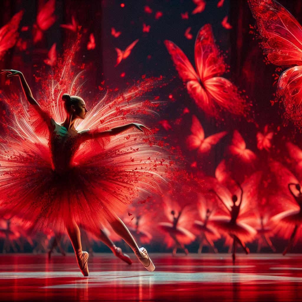 art, ballerina, beautiful, butterflies, dance, delicate, digital, dreamlike, elegant, ethereal, fantasy, graceful, illustration, light, performance, red, stage, surreal, tutu, wings