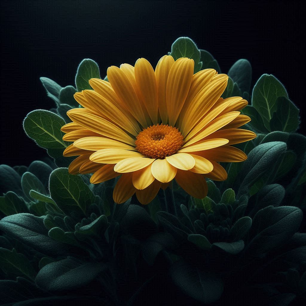 A single yellow daisy flower with a dark green center blooms in the center of the frame against a dark background.