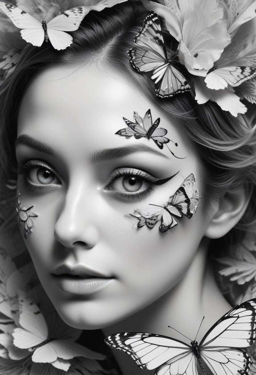A woman's face is adorned with butterflies, creating a delicate and ethereal look.