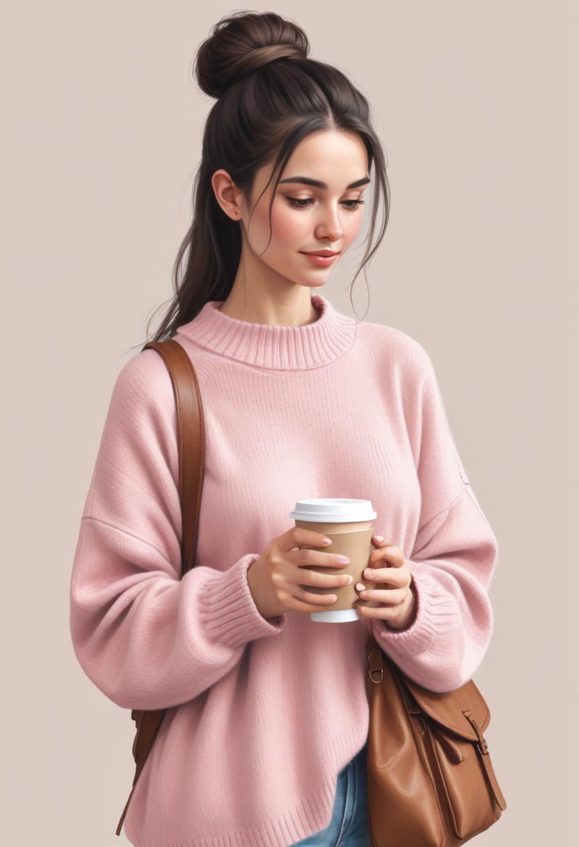 art, bag, brown, bun, coffee, cup, digital, fashion, female, hair, hands, hold, illustration, long, messy, pink, shoulder, sweater, wear, woman