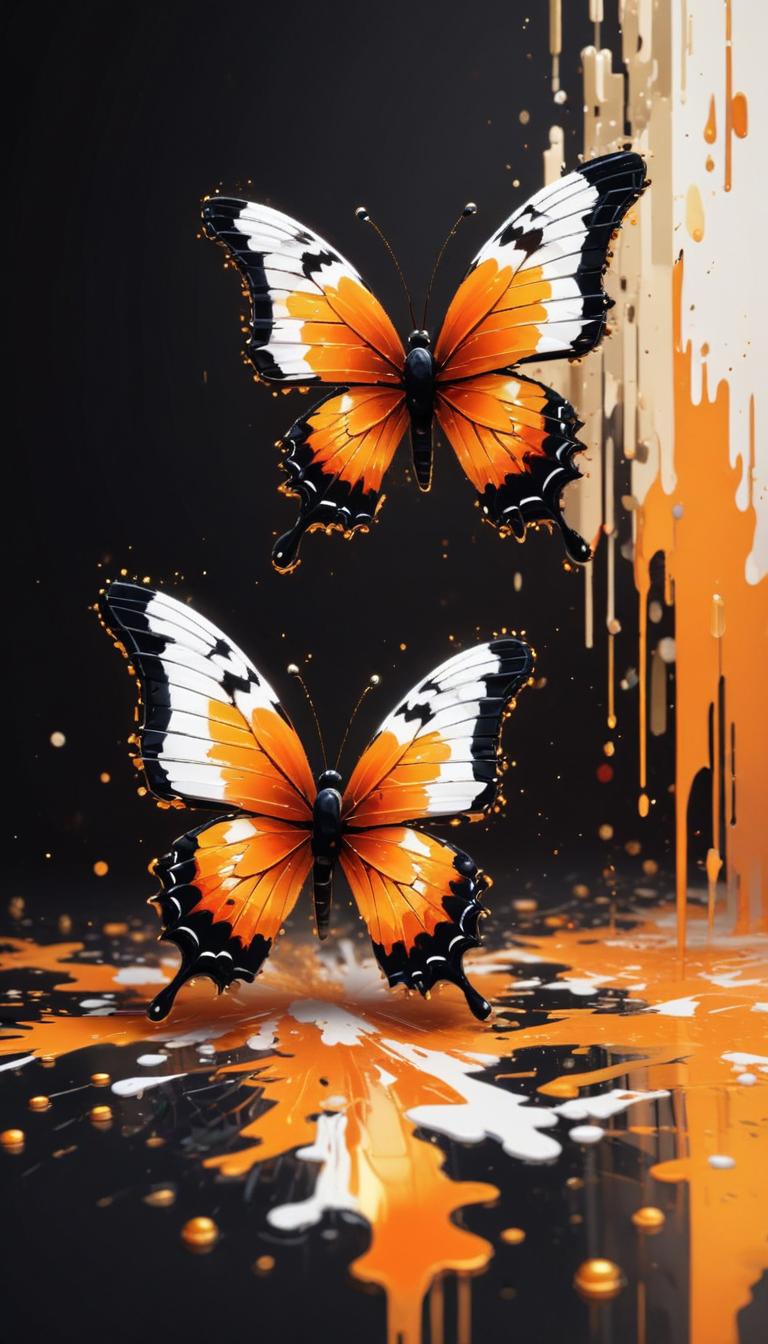 Two orange butterflies with black and white wings fly over a black surface with orange and white paint splatters.