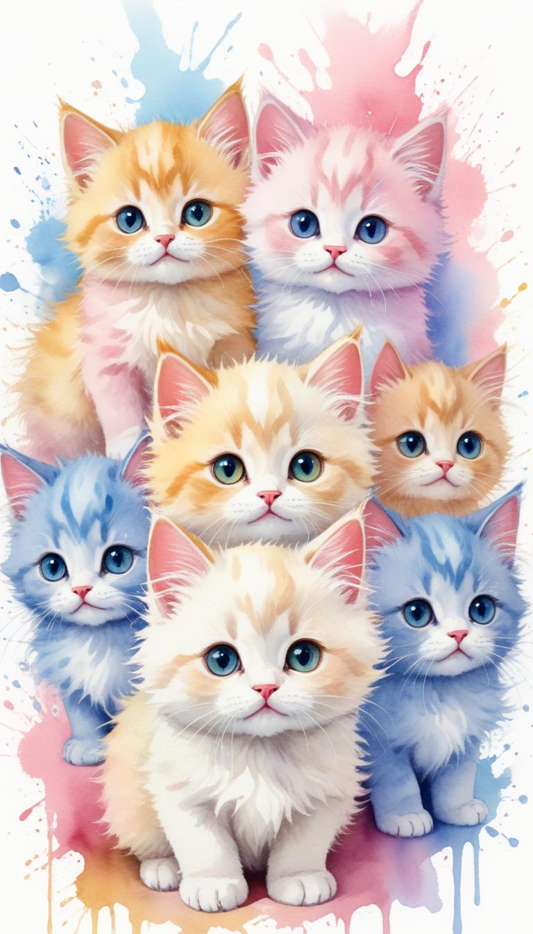 Six adorable kittens are positioned in a stack, surrounded by watercolor splatter.