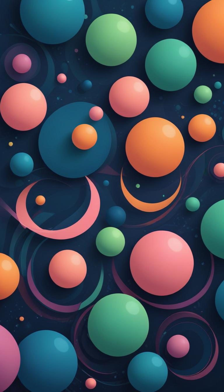 A digital illustration of colorful spheres floating on a dark blue background with swirling lines.