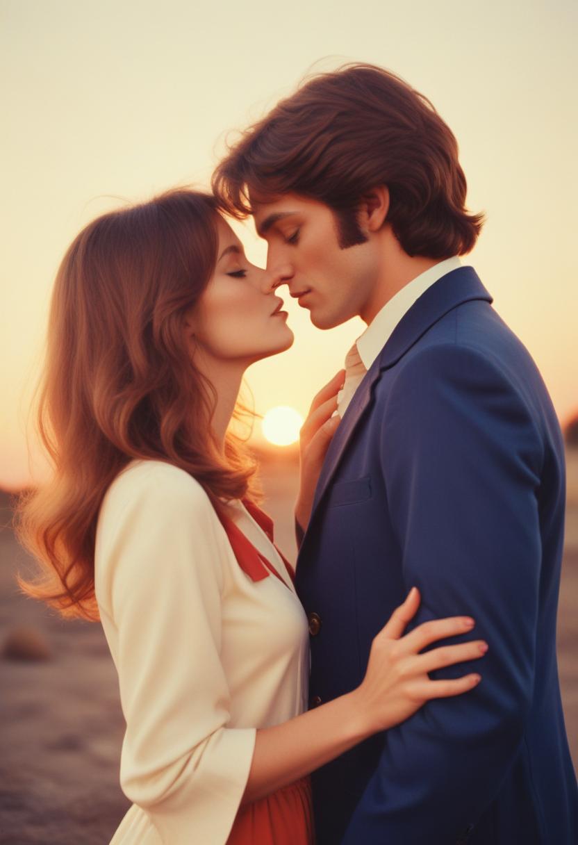 affection, blue, couple, dusk, embrace, fashion, intimacy, kiss, love, man, orange, outdoors, red, romantic, sky, story, sunset, togetherness, white, woman