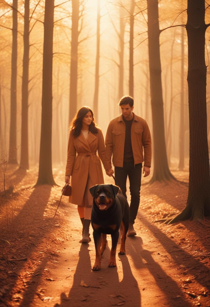 A couple walks through a forest with their Rottweiler on a leash. The sun is shining through the trees, casting long shadows on the ground.