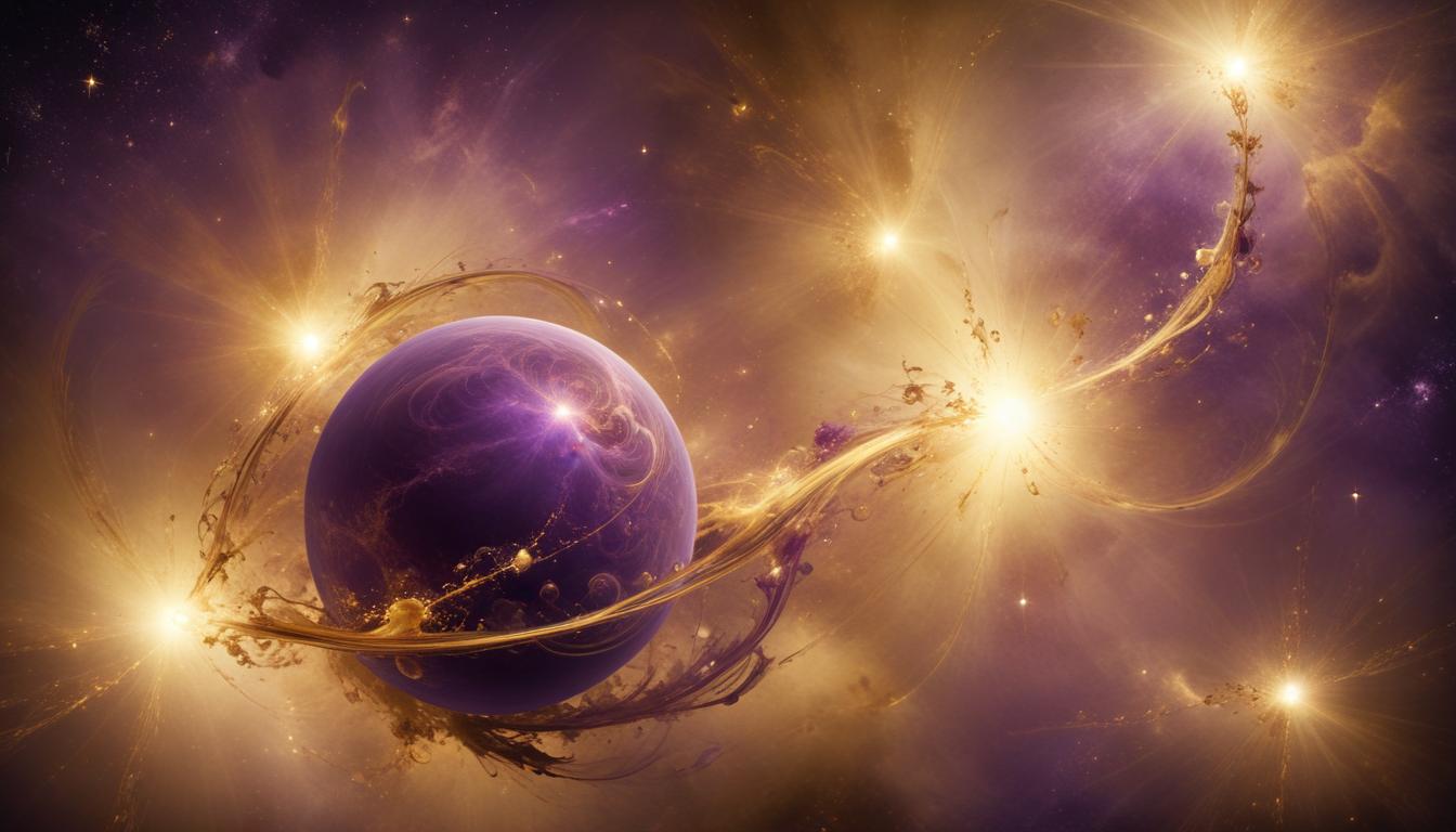 A vibrant purple planet is surrounded by glowing stars in a swirling cosmic nebula.