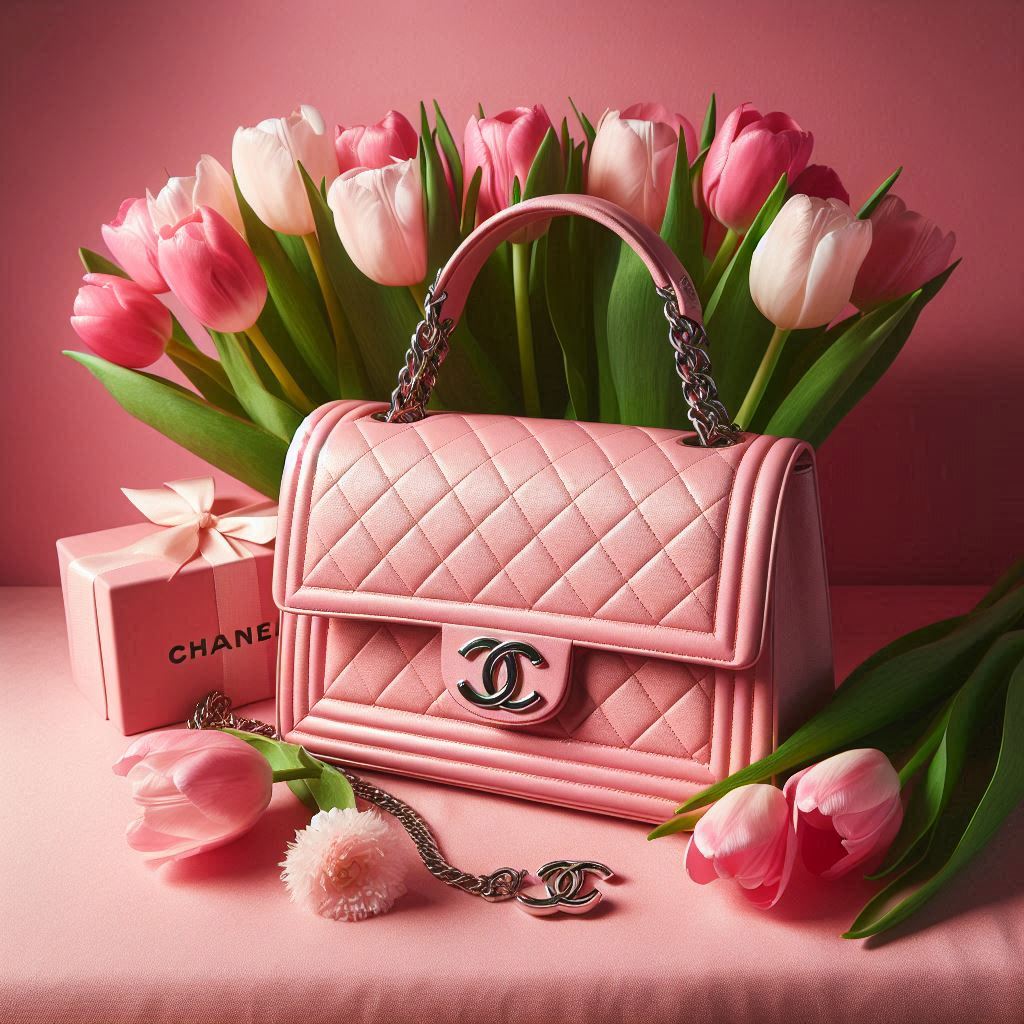 accessory, bouquet, box, chain, chic, delicate, fashion, feminine, floral, flowers, gift, handbag, leather, luxury, pink, present, romantic, spring, style, tulips