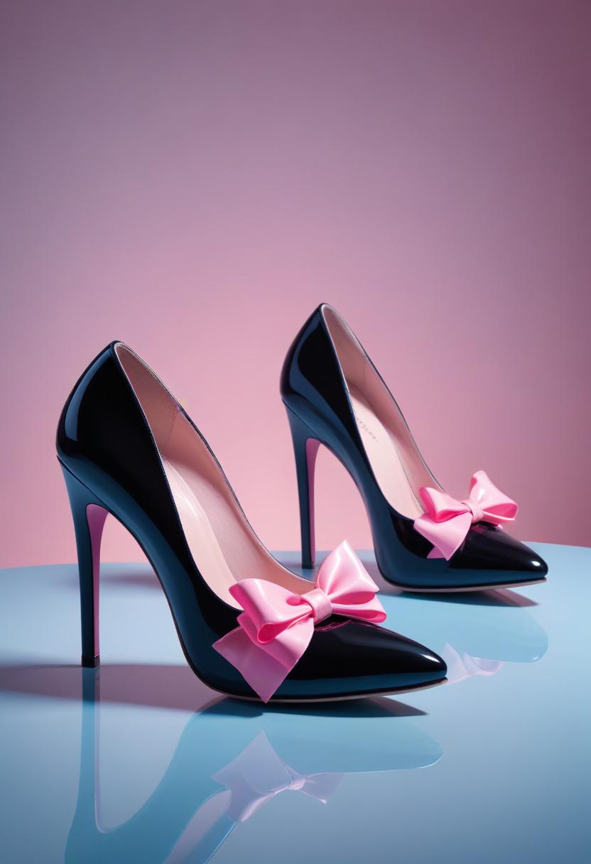 Two black high heels with pink bows are on a blue surface.