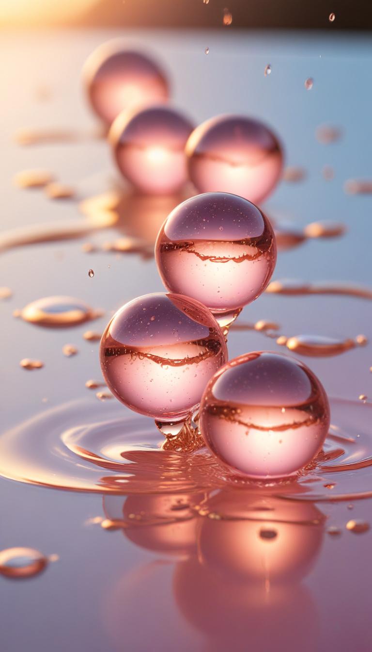 abstract, clear, floating, glass, golden, light, liquid, macro, nature, pattern, pink, reflection, ripple, smooth, spheres, still, sunset, surface, texture, water