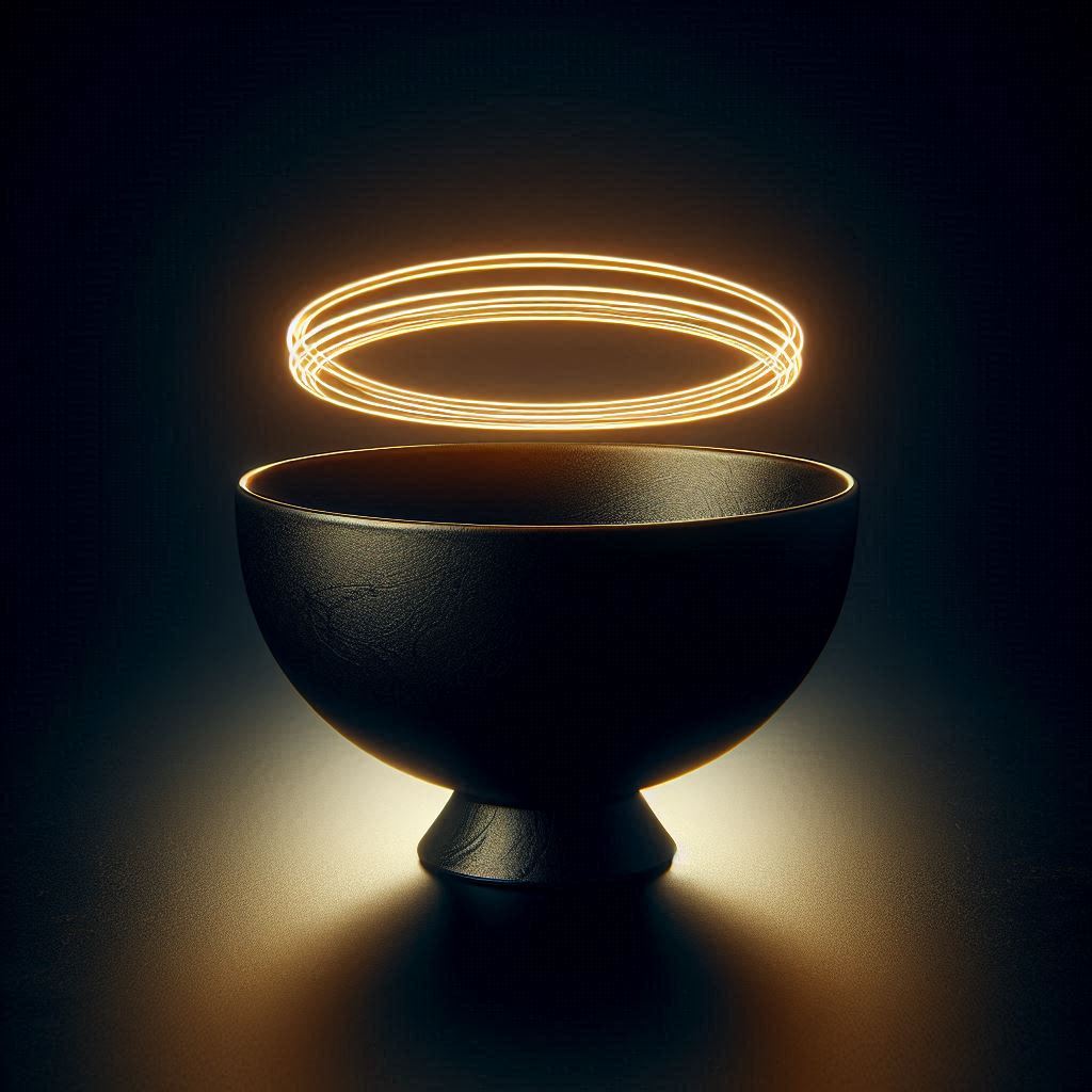 A black bowl sits on a dark surface, with a glowing halo of light hovering above it.