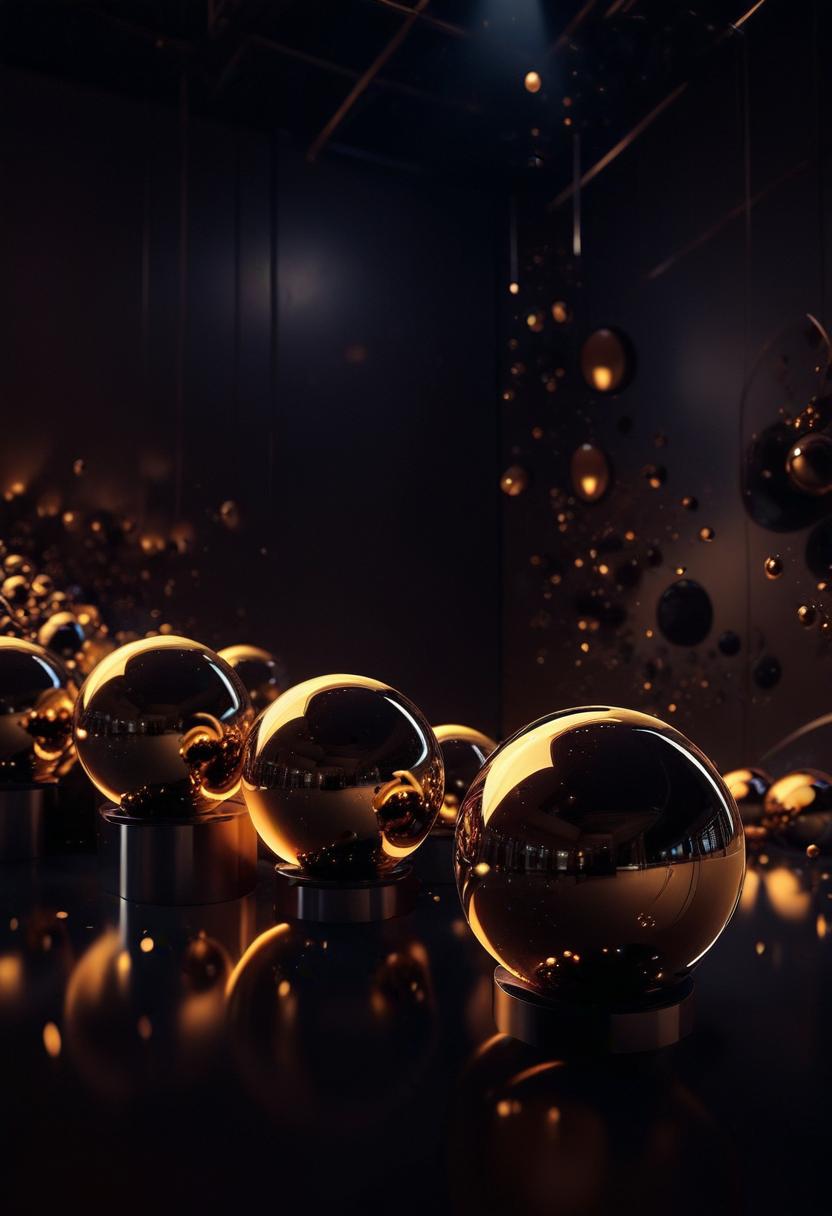 abstract, ambient, art, black, contemporary, dark, design, floating, glow, golden, installation, interior, light, metallic, minimalist, reflections, room, shiny, spheres, texture