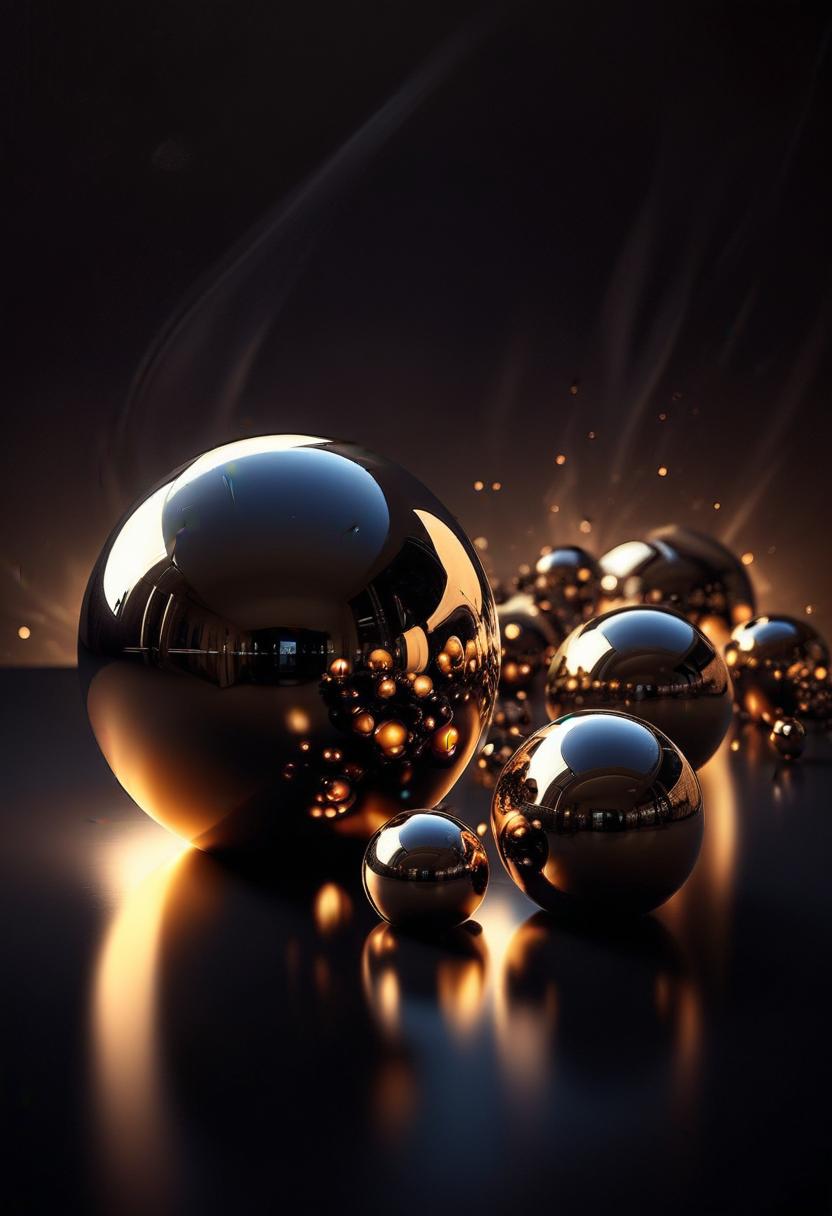 Metallic spheres of varying sizes rest on a dark surface with a faint, golden light emanating from below.
