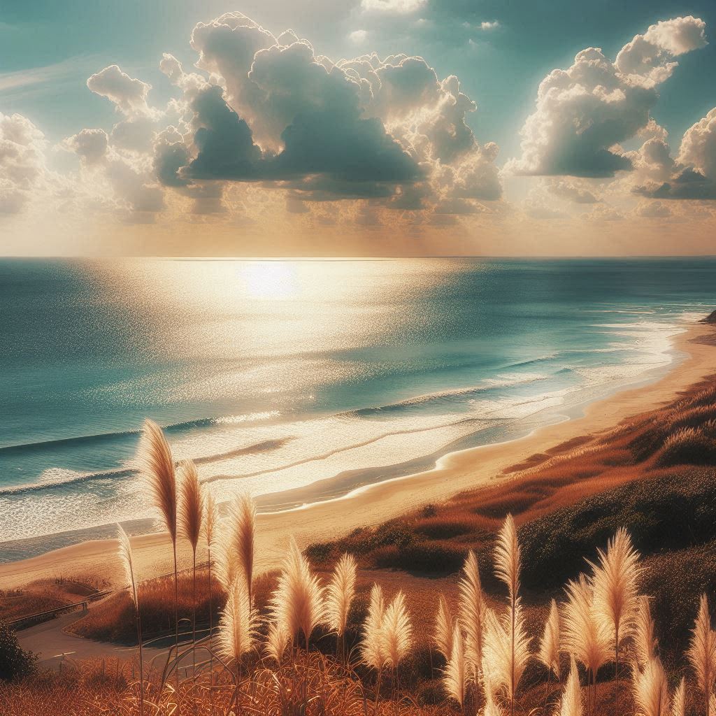 A panoramic view of a sandy coastline with waves lapping on the shore, fluffy grass in the foreground, and a bright, golden sunset in the sky.