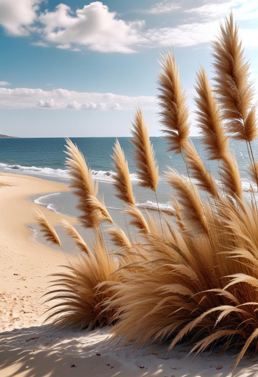 Tall grass blowing in the wind on a sandy beach with blue ocean and a cloudy sky in the background.