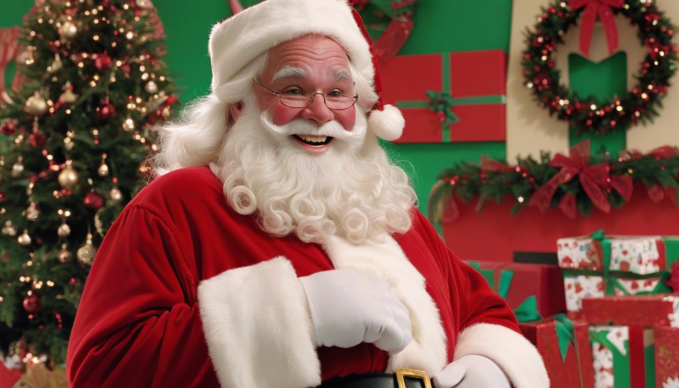 Santa Claus smiles in front of a Christmas tree, hands near his stomach, surrounded by gifts and a wreath