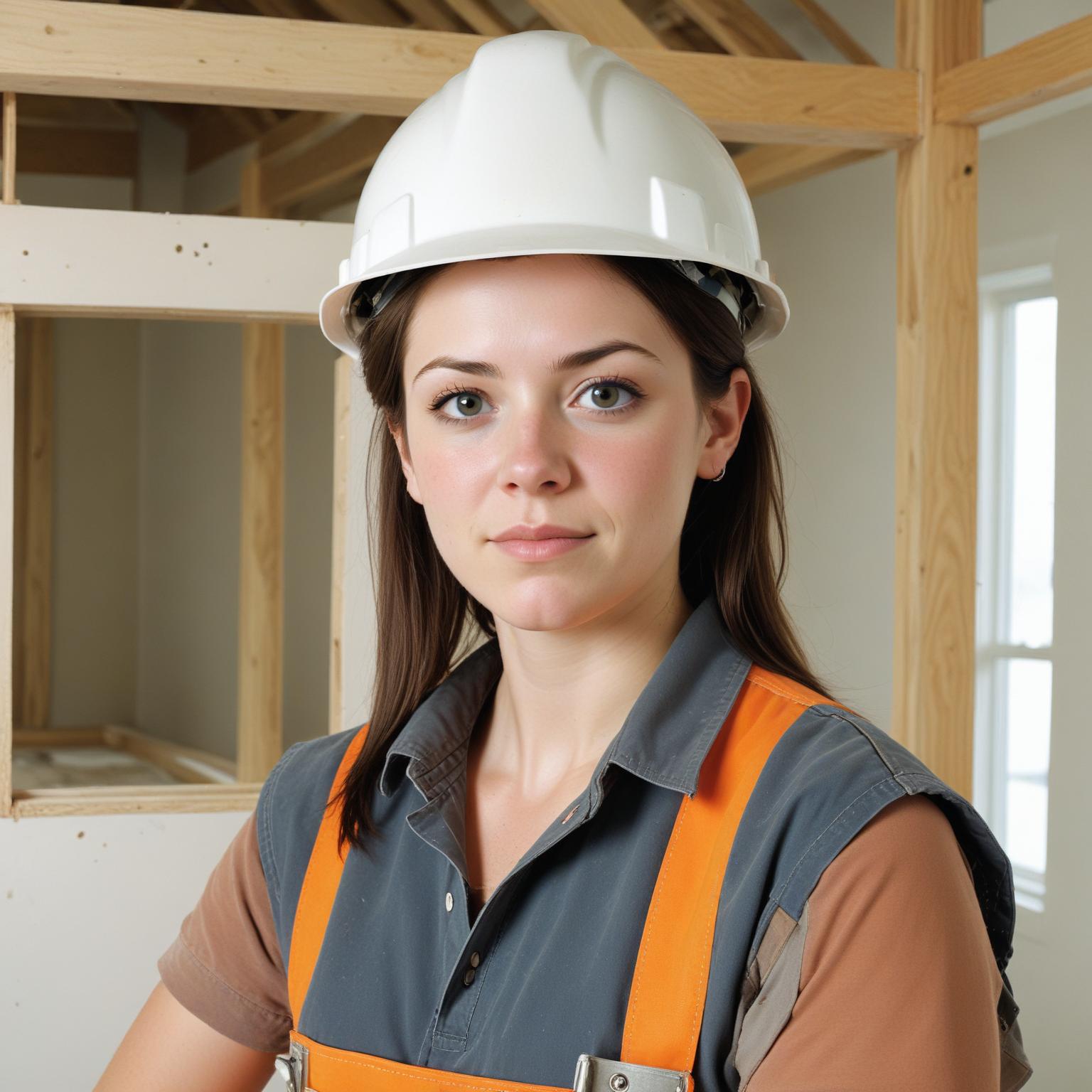 A woman wearing a hard hat and work clothes stands in a partially finished room.