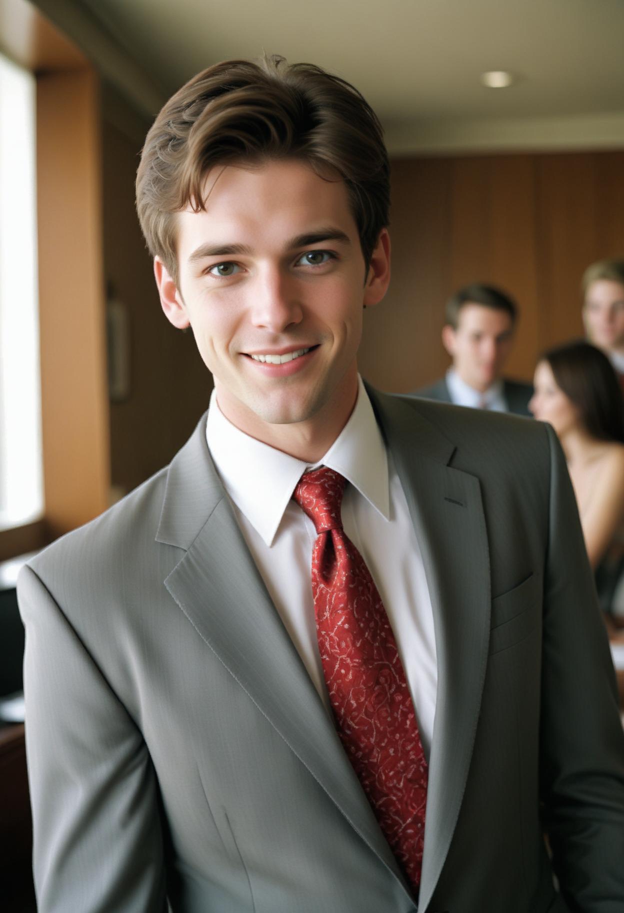 A man in a grey suit and red tie smiles confidently while standing in an office setting.