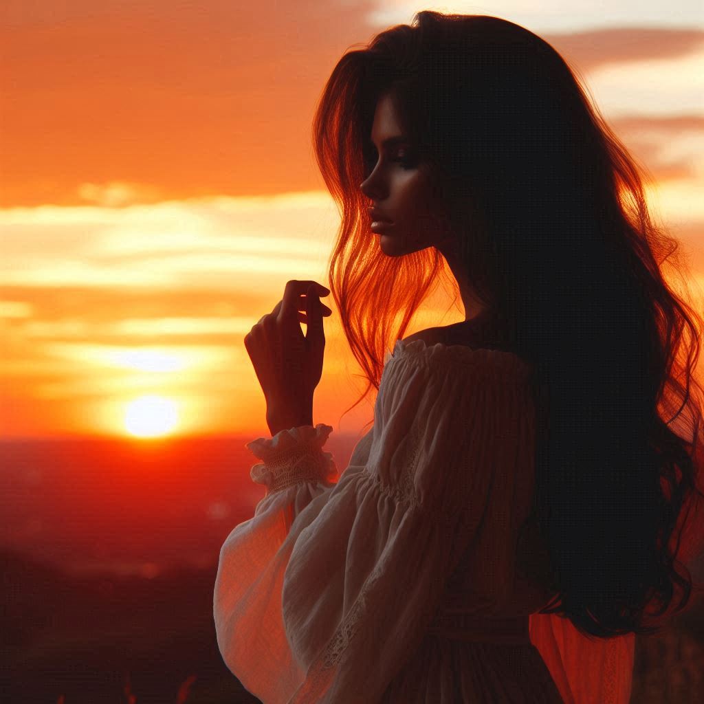 A woman with long hair stands in silhouette against a vibrant sunset.