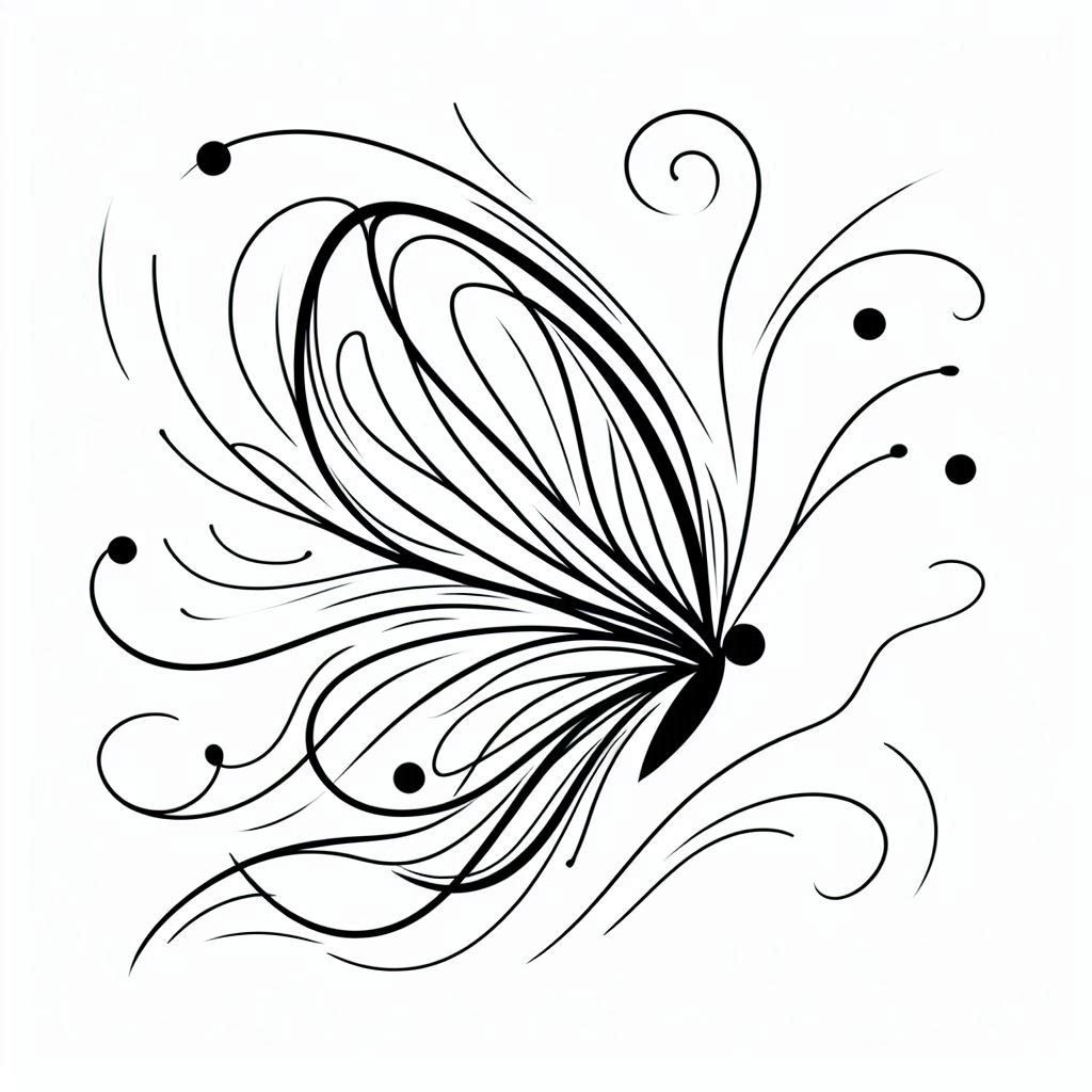 A black and white line drawing of an abstract butterfly with delicate wings and intricate details.