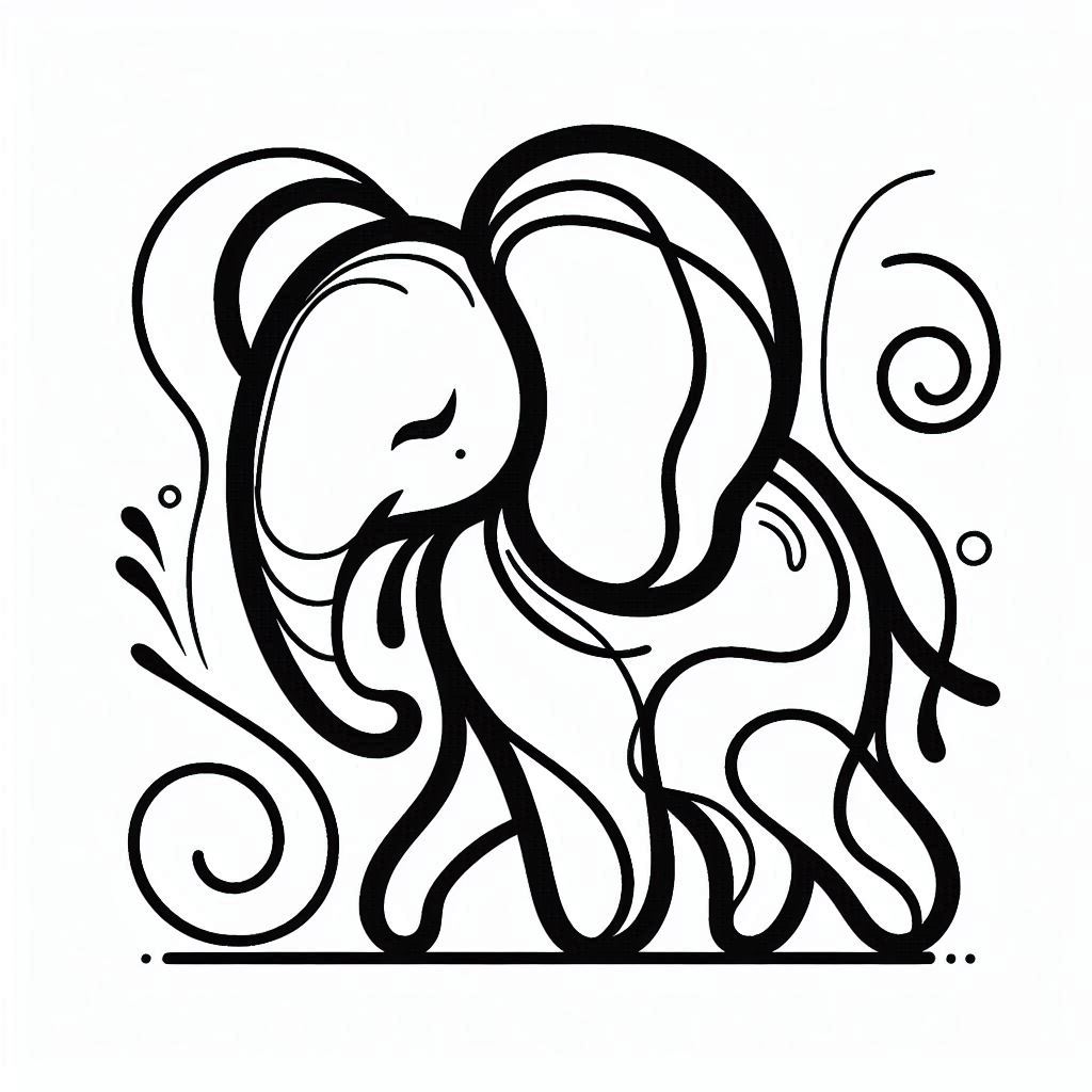 A black and white abstract line drawing of an elephant walking with its trunk up, adorned with decorative flourishes