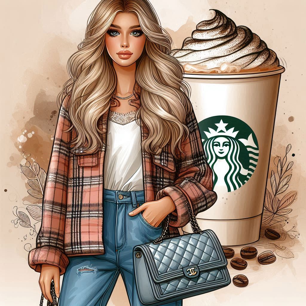 bag, beans, beverage, casual, coffee, cream, cup, cute, drink, fashion, girl, handbag, illustration, jeans, lifestyle, plaid, shirt, style, whipped, woman