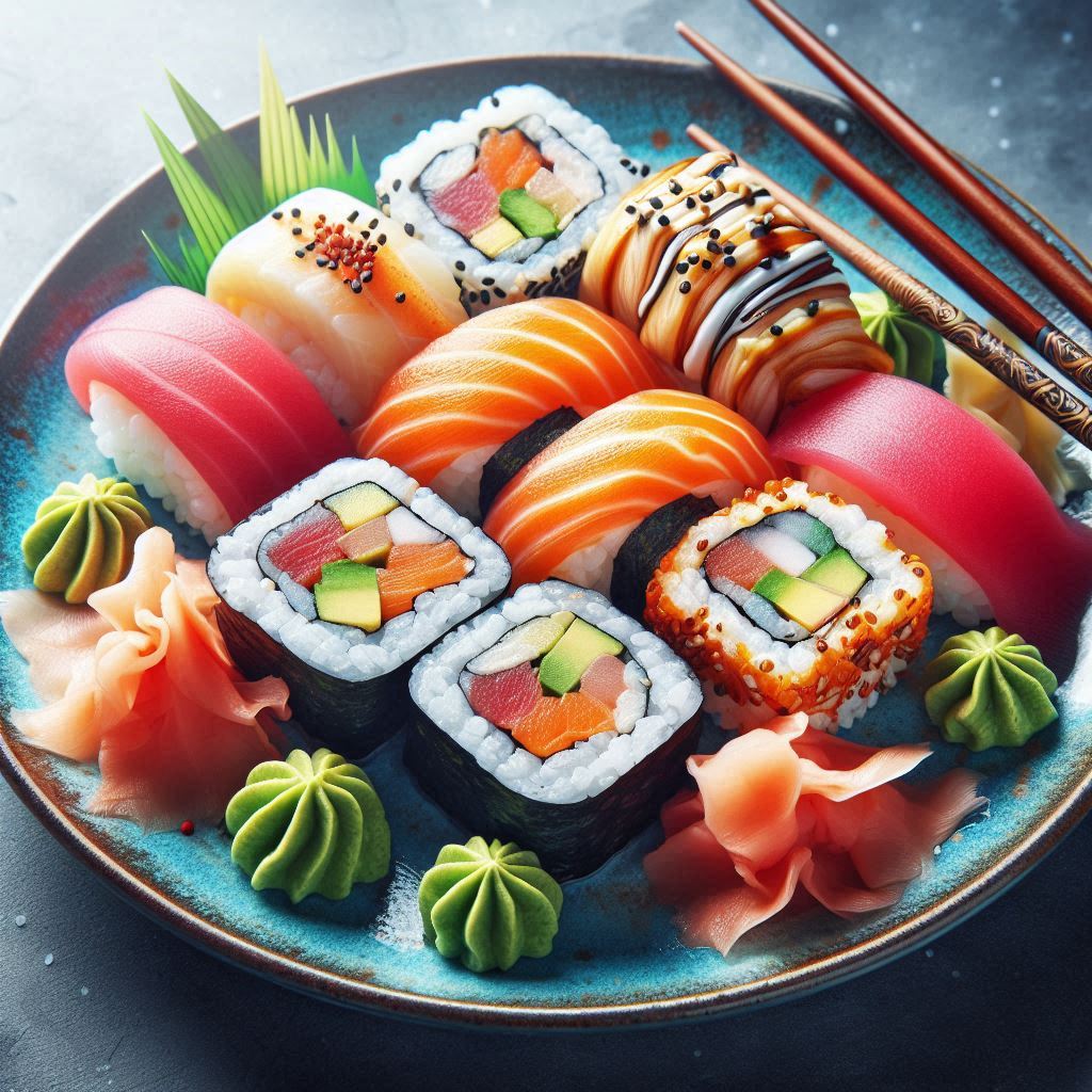 A plate of various sushi rolls, including salmon, tuna, and avocado, served with pickled ginger and wasabi.