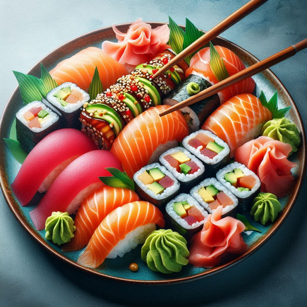 A plate of sushi with various types of rolls, nigiri, and maki, garnished with wasabi and pickled ginger. Chopsticks are resting on the plate.