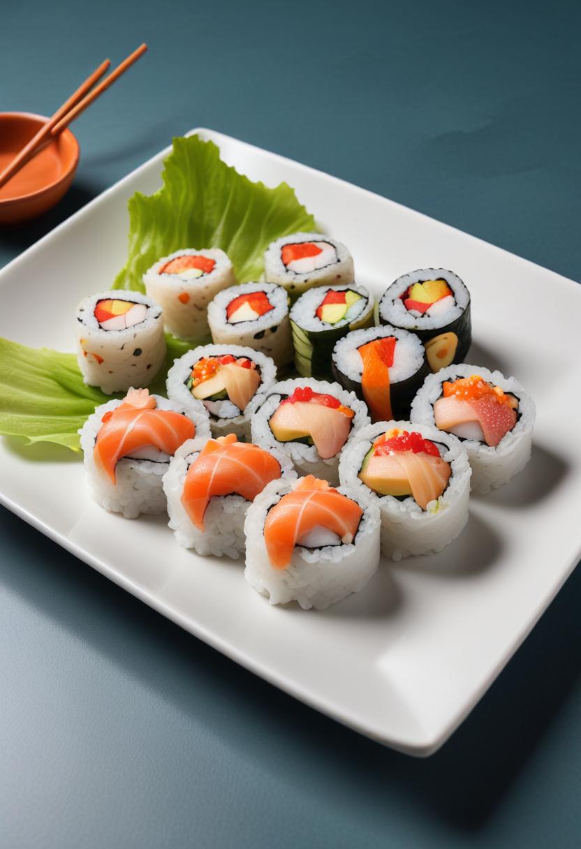 A plate of freshly made sushi rolls, featuring both salmon and vegetable fillings, arranged on a white plate with a leafy green garnish.