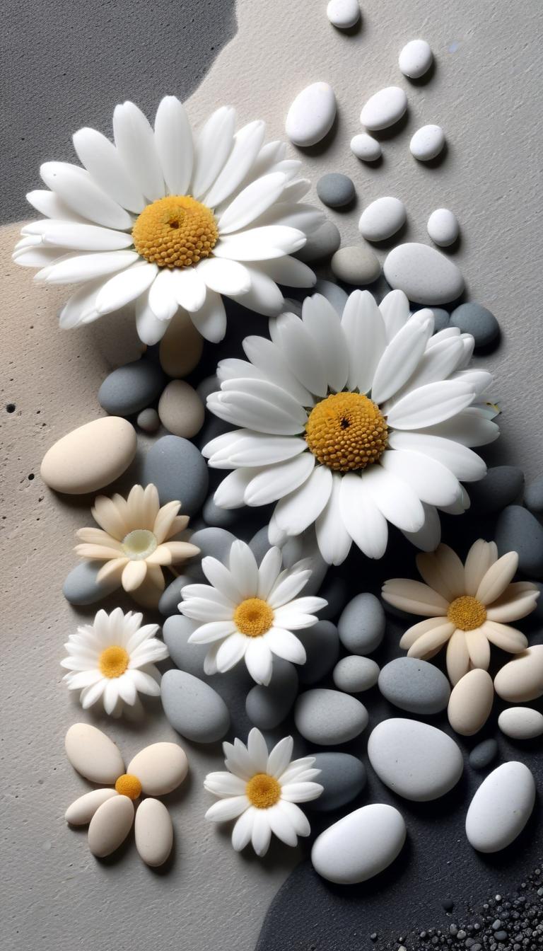 arrangement, art, background, beauty, botanical, daisies, design, floral, flower, gray, minimalist, natural, nature, petals, simplicity, smooth, stones, texture, white, zen