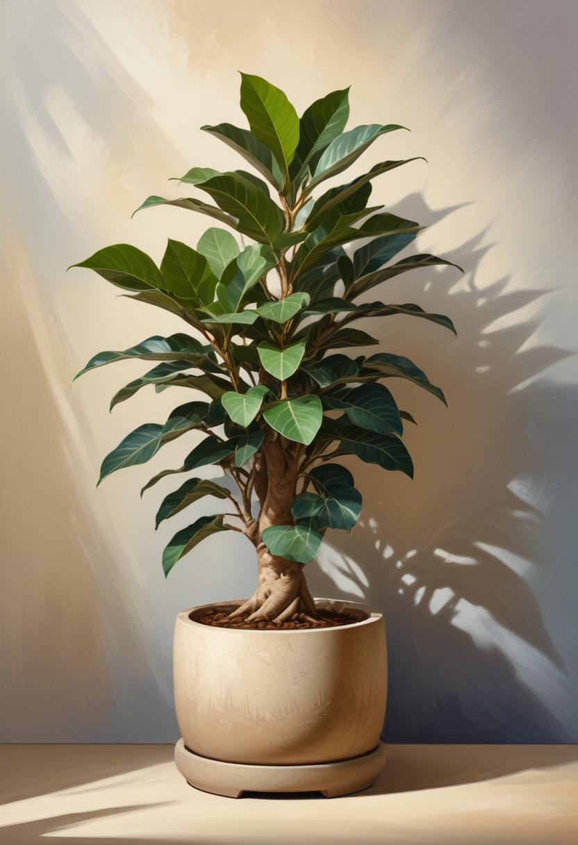 beige, botany, decor, ficus, foliage, green, home, indoor, leaves, light, natural, plant, pot, potted, shadow, sunlight, surface, tree, wall, wooden
