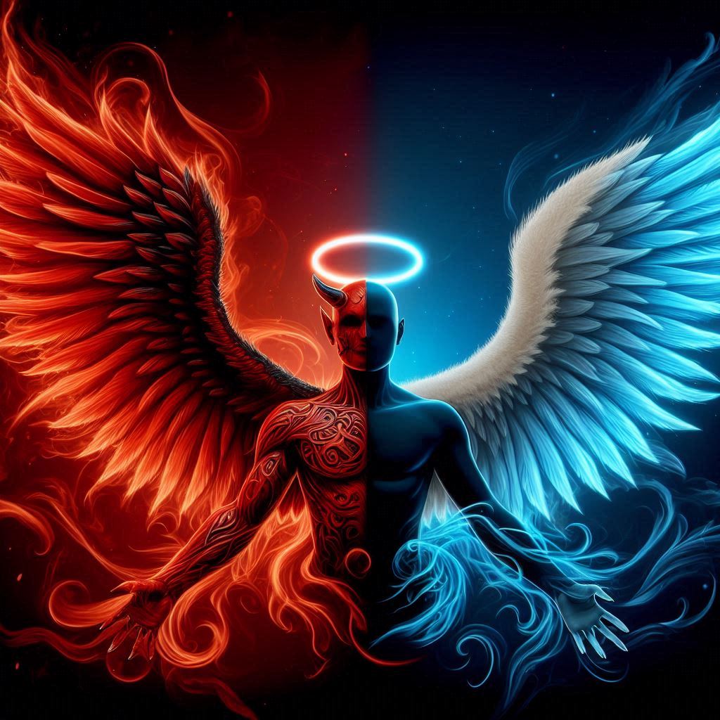 angel, art, artwork, blue, celestial, dark, demon, digital, evil, fantasy, good, halo, heaven, hell, illustration, light, mythical, red, supernatural, wings