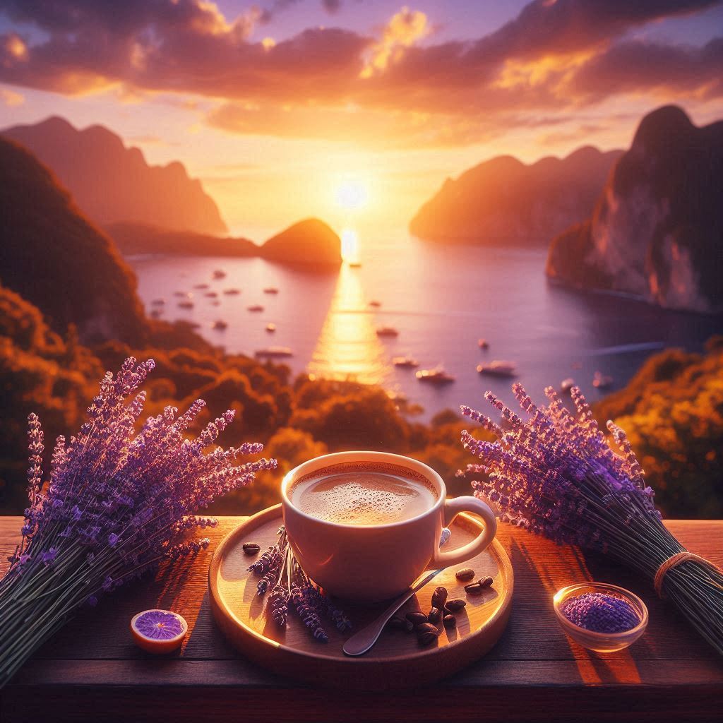 A coffee cup rests on a wooden table, gazing at a stunning sunset over water and islands, with lavender flowers enhancing the view
