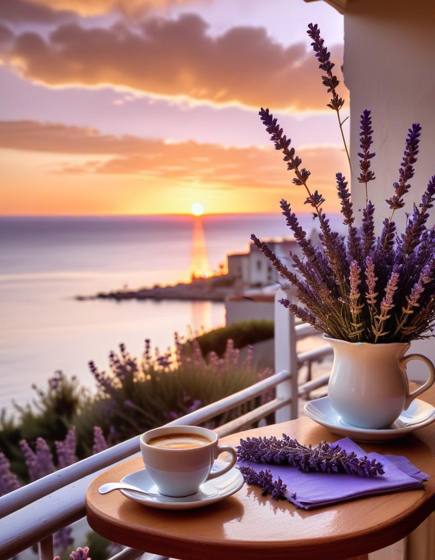 balcony, beautiful, beverage, coastline, coffee, cup, drink, evening, flowers, lavender, morning, nature, ocean, peaceful, purple, relaxing, sea, sunrise, sunset, view