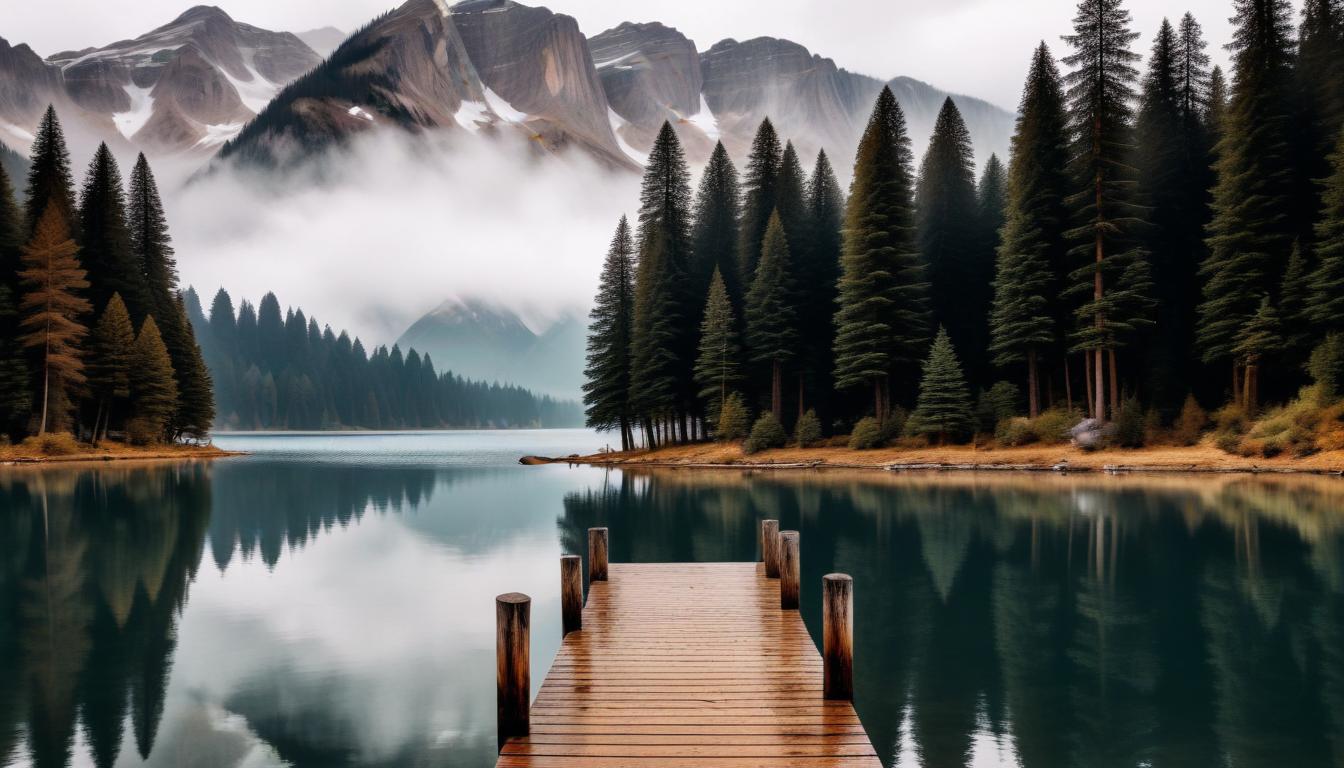 adventure, dock, fog, forest, lake, landscape, mountain, nature, outdoors, peaceful, pine, quiet, reflection, scenic, serenity, tranquil, travel, trees, water, wooden