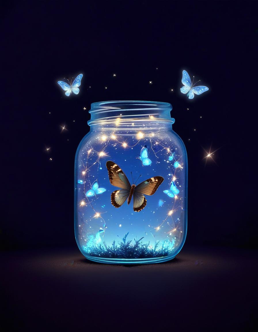 blue, butterfly, dark, dream, fairy, fantasy, freedom, glass, glow, hope, insect, jar, light, magical, nature, night, sparkle, twinkle, whimsical, wing