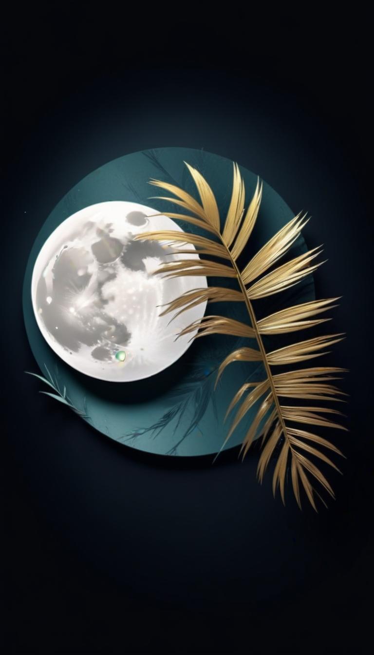 A large, full moon sits in a teal circle, with a golden palm leaf extending from the right side.